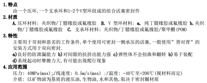 压力: 40MPa(max);/线速度: 0.5m/s(max);/温度: -40℃至+200℃(视材料而定)介质: 以矿物油为基质的液压油,生物油,水和其他,取决于密封圈材质